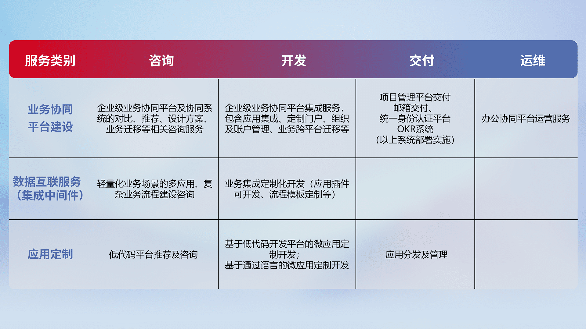 针对钉钉、、、、企微、、、IDaas等平台级产品提供产品的规划、、方案、、、交付、、、、定制化开发等服务,,,,实现如统一协同办公、、、智能客户服务、、、、混合会议管理、、、智能数据查询、、、等业务场景,,,,实现数字化转型。。。。