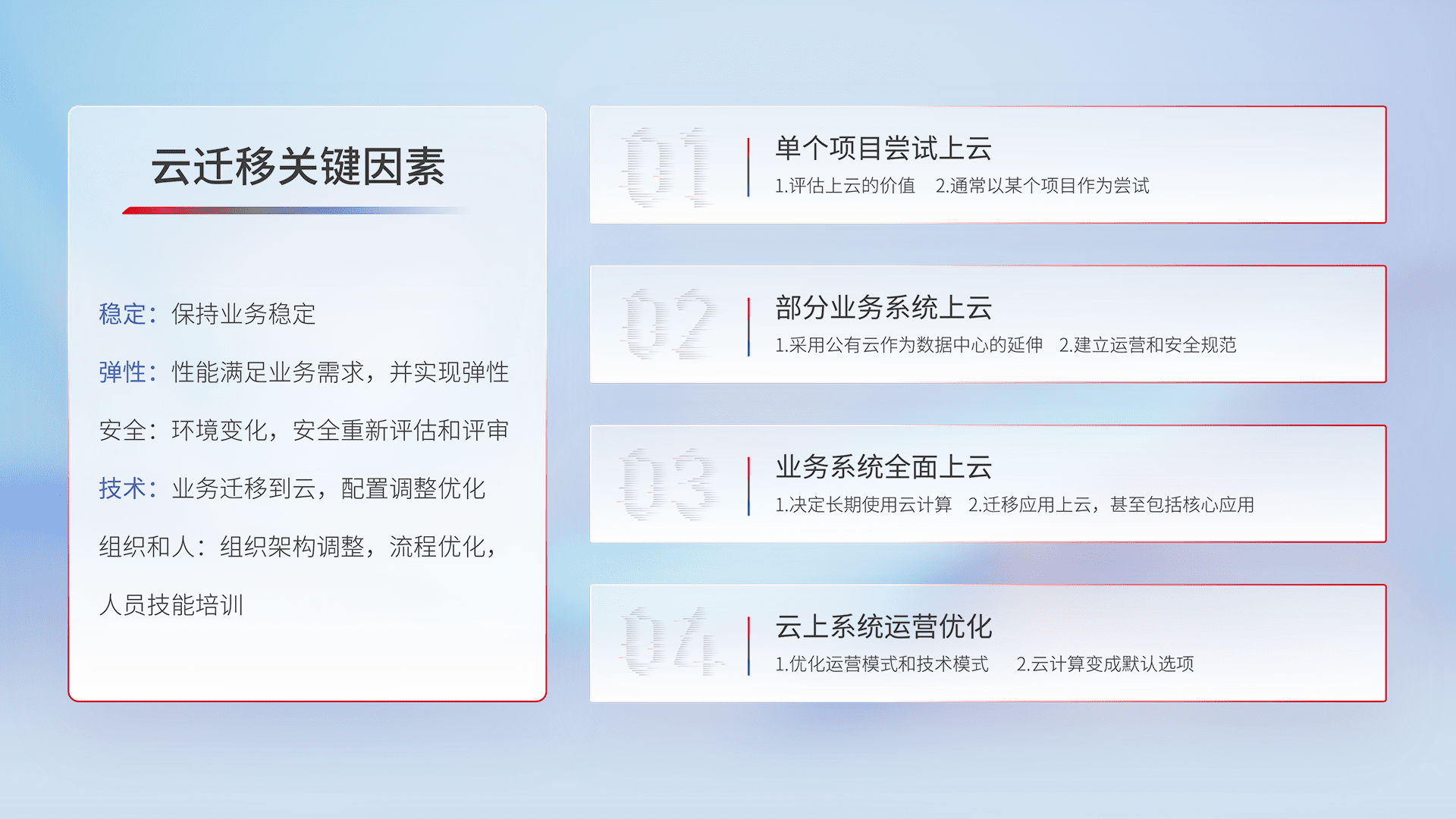 结合实际业务,,,,从规划设计、、、、云平台选型、、、云原生改造、、、、数据迁移、、、集成交付,,迁移全过程为客户识别最佳上云路径,,,做好风险识别管理,,,,设计网络架构、、、身份权限、、、安全审计合规、、、、操作审计、、日志审计、、、监控告警策略、、多站点容灾设计等,,,对云上基础设施进行整体规划,,,提升IT治理水平,,,以满足弹性、、、、高可用、、、高性能的需求。。。