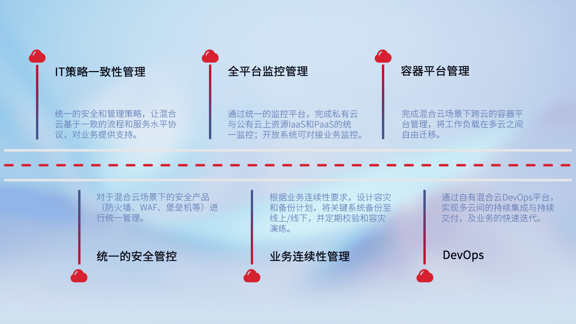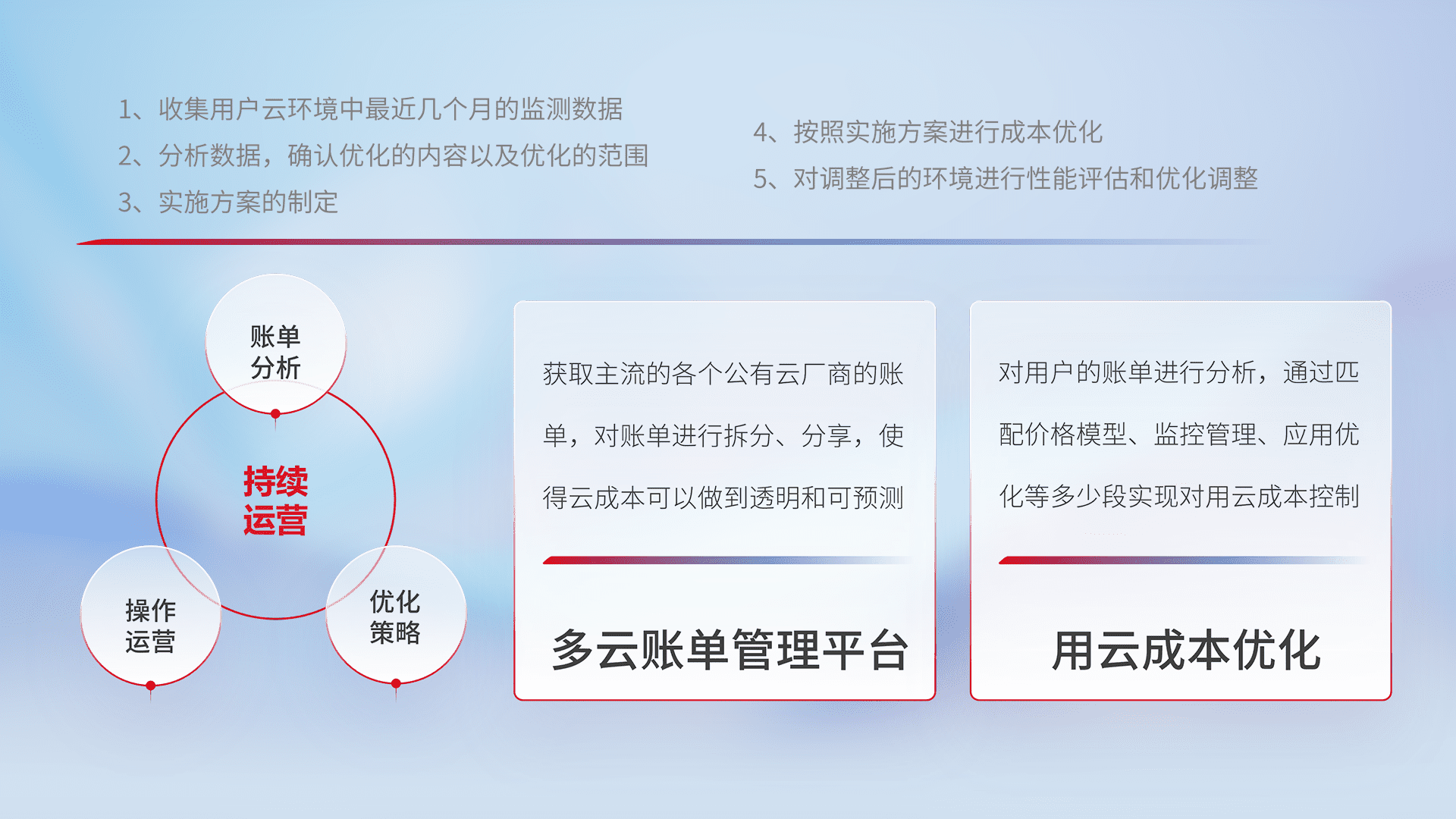 通过多云纳管,,,,以统一的资源数据模型把客户的云资源进行抽象和封装,,,,进而实现对多云资源的统一操作,,,保障云资源管理的可靠性、、、、稳定性与可用性。。。。量身定制化运维内容,,配置、、、开发运维、、补丁管理、、、、备份、、、、监控、、认证和访问管理、、审计和日常巡检等,,,,保障在用云过程中的可靠度,,,,稳定度以及高可用率。。。