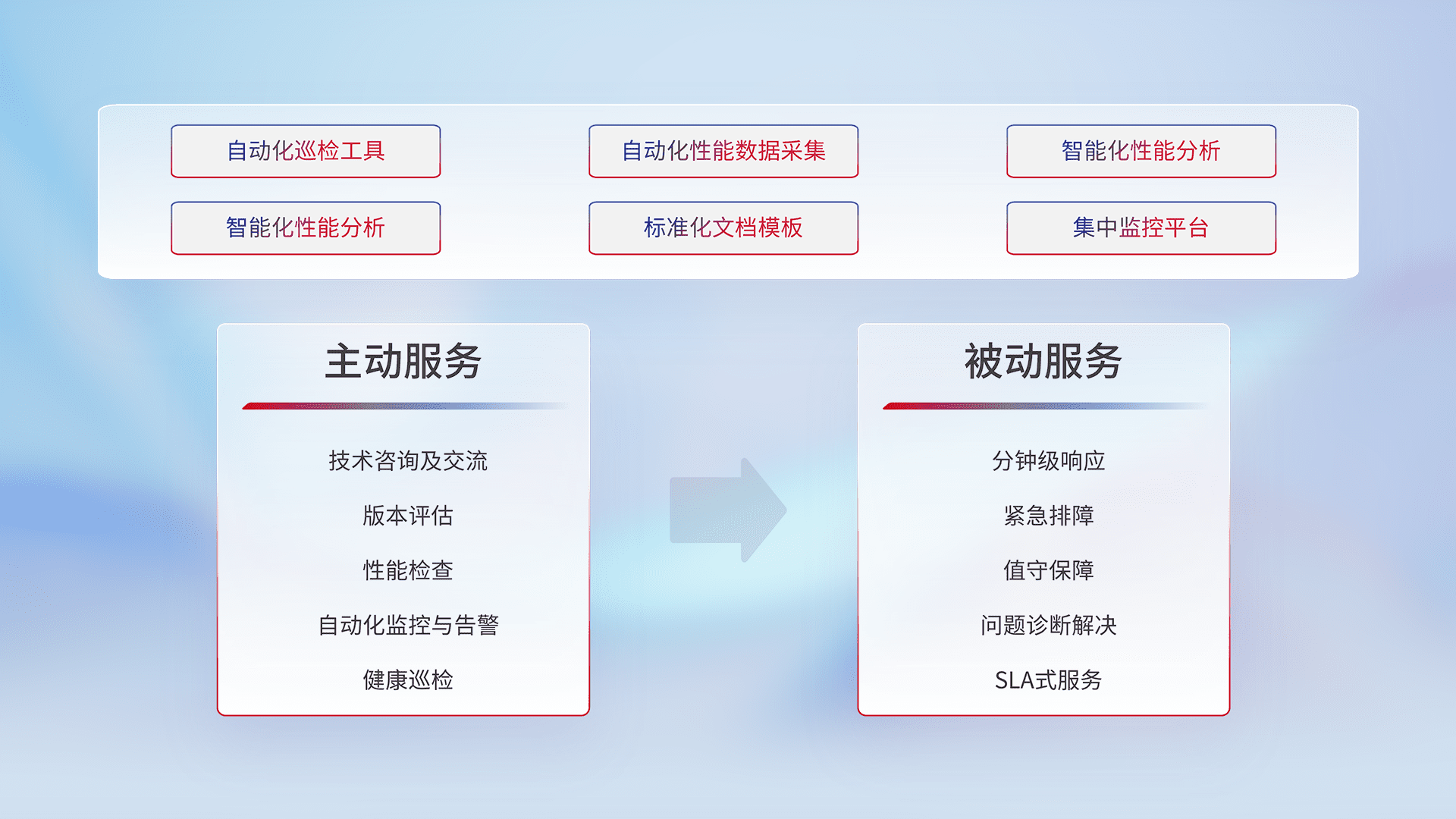 智能化工具和标准化文档,,,保障服务质量,,提供主动服务(包含技术咨询、、版本评估、、、性能检查、、、自动化监控与告警、、健康巡检)和被动服务包含(分钟级响应、、、紧急排障、、值守保障、、、问题诊断解决、、SLA服务)。。